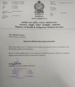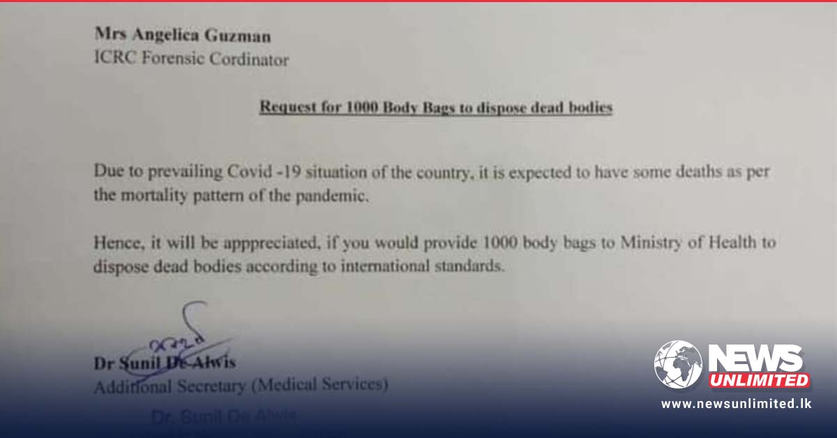 මේ සම්බන්ධයෙන් අදහස් දක්වමින් ඔහු කියා සිටියේ එම ලිපියට අනුව මෘත ශරීර බහාලන මළු 1,000ක් පමණ ඉල්ලා තිබුණත් එමගින් රජය විසින් කොවිඩ් – 19 ආසාධනය වීමෙන් මරණ 1,000ක් සිදු වන බවට බලාපොරොත්තු නොවන බවයි.
