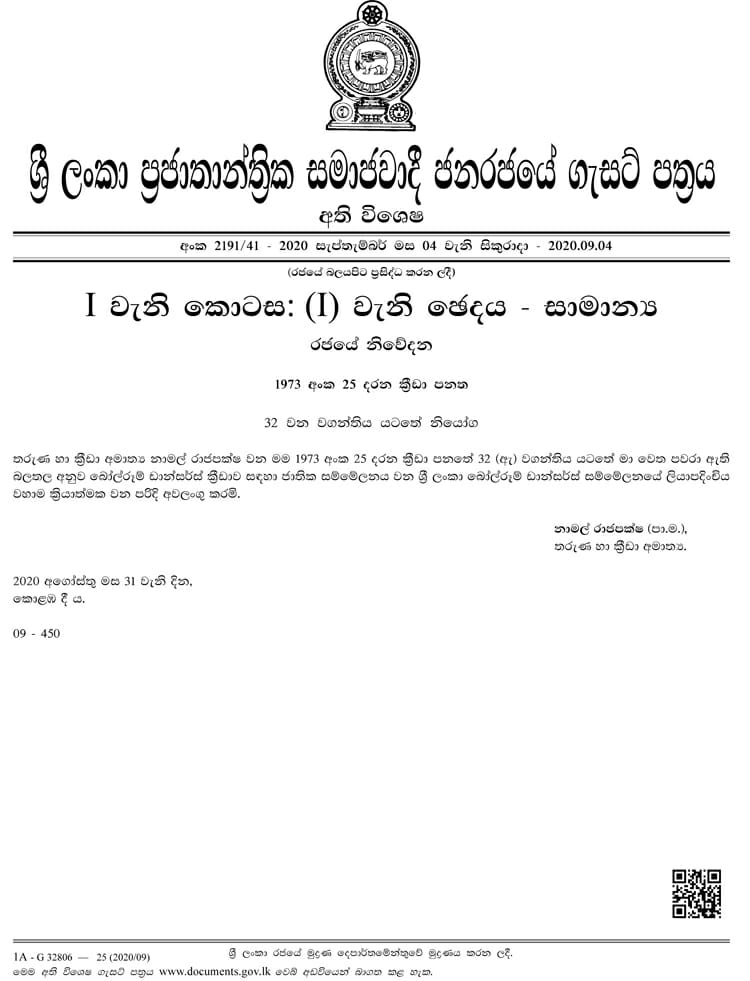 සිදු කළ විශේෂ පරීක්ෂණයකින් පසු 1972 අංක 25 දරණ ක්රීඩා පනතේ 32 (ඇ) වගන්ති ප්රකාරව ක්රීඩා අමාත්යවරයාට පැවරී ඇති බලතල අනුව ශ්රී ලංකා බෝල්රූම් ඩාන්සින් සම්මේලනයේ ලියාපදිංචිය අවලංගු කරන ලද බව ක්රීඩා හා තරුණ කටයුතු අමාත්යංශය නිවේදනය කරයි.